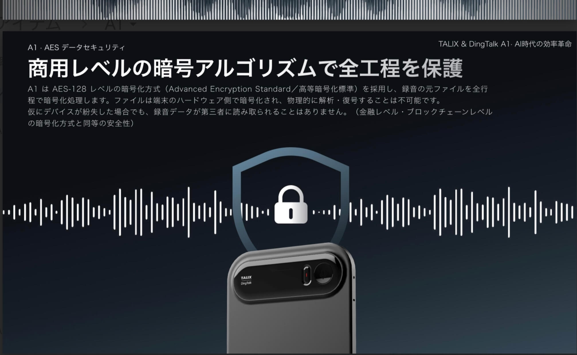 TALIX & DingTalk A1で録音された音声データは、AES-128レベルの暗号化方式で暗号化されます。