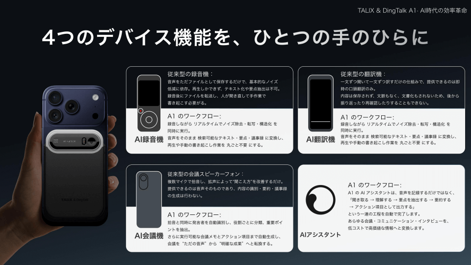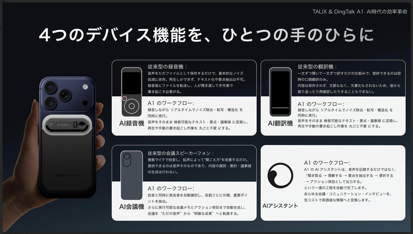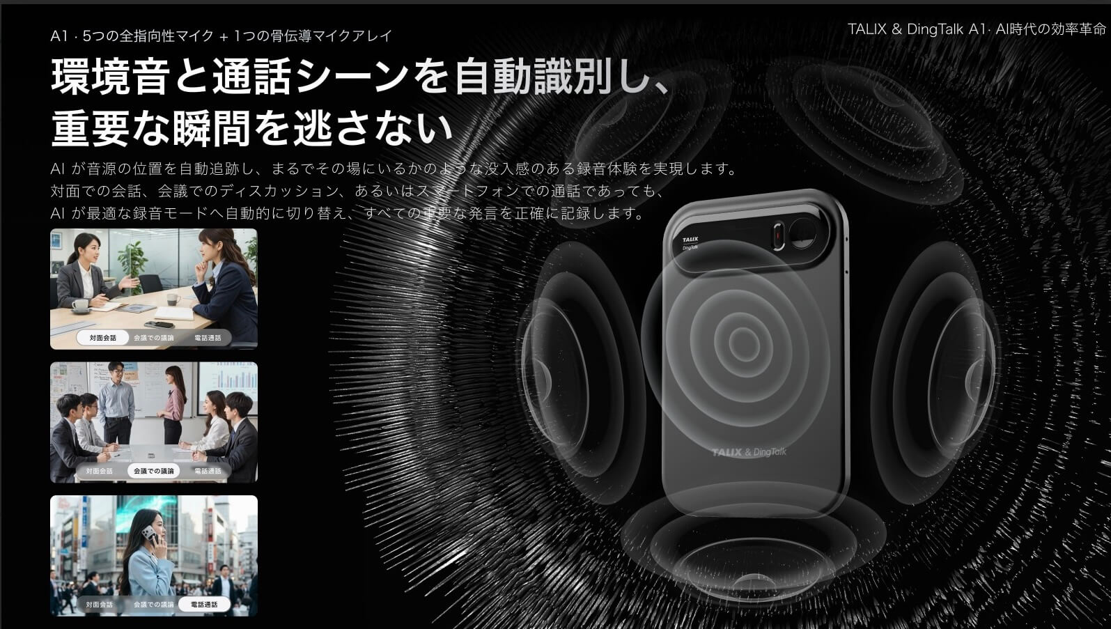 TALIX & DingTalk A1は、会議や商談、通話といった音声情報の録音・文字起こし・要約までを自動化し、企業クラウドと連携して活用できるAI音声デバイスです。