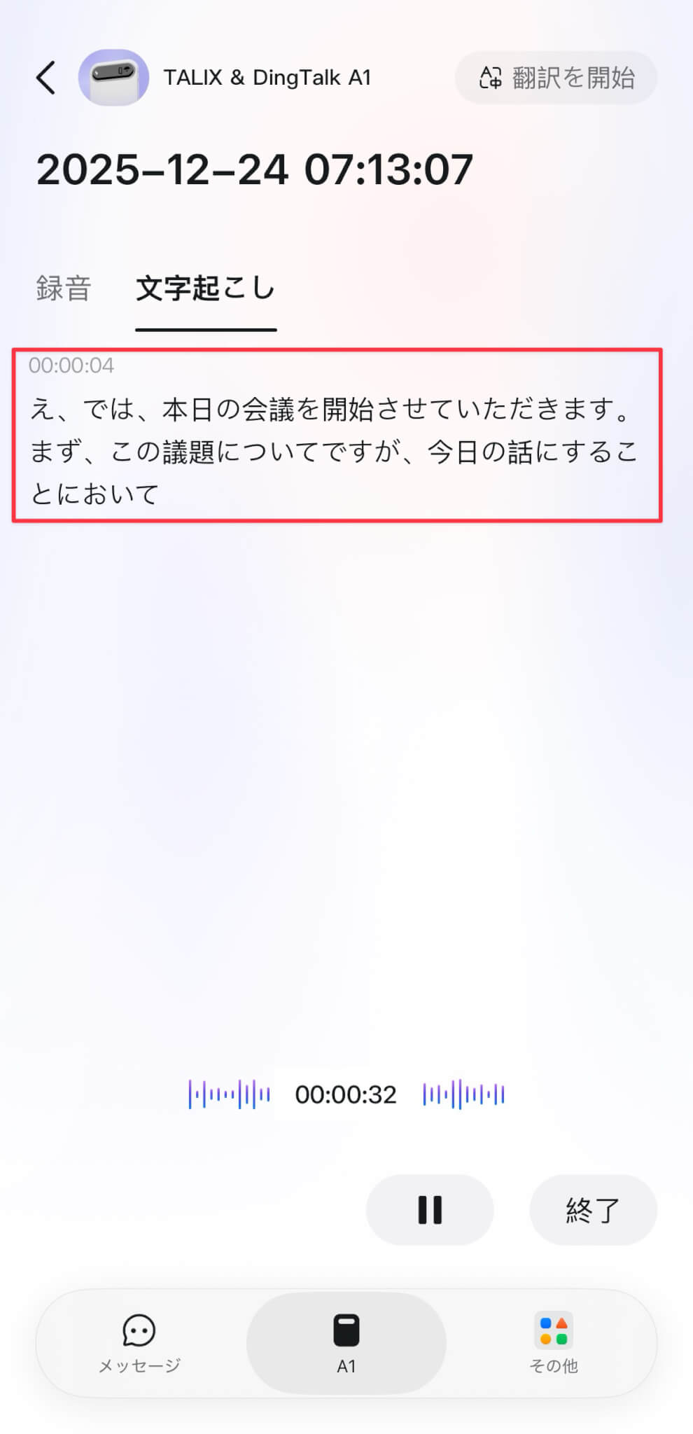 会議や商談、通話などの音声をA1デバイスで録音し始めると、リアルタイムで文字起こしが生成されます。話者を識別し、逐語録として記録できます。