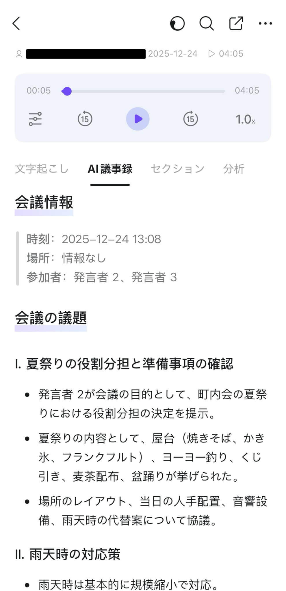 また、会話の流れから重要なポイントやTodoが分かりやすく整理されるため、決定事項やタスクの抜け漏れを防ぎやすい点も特徴です。