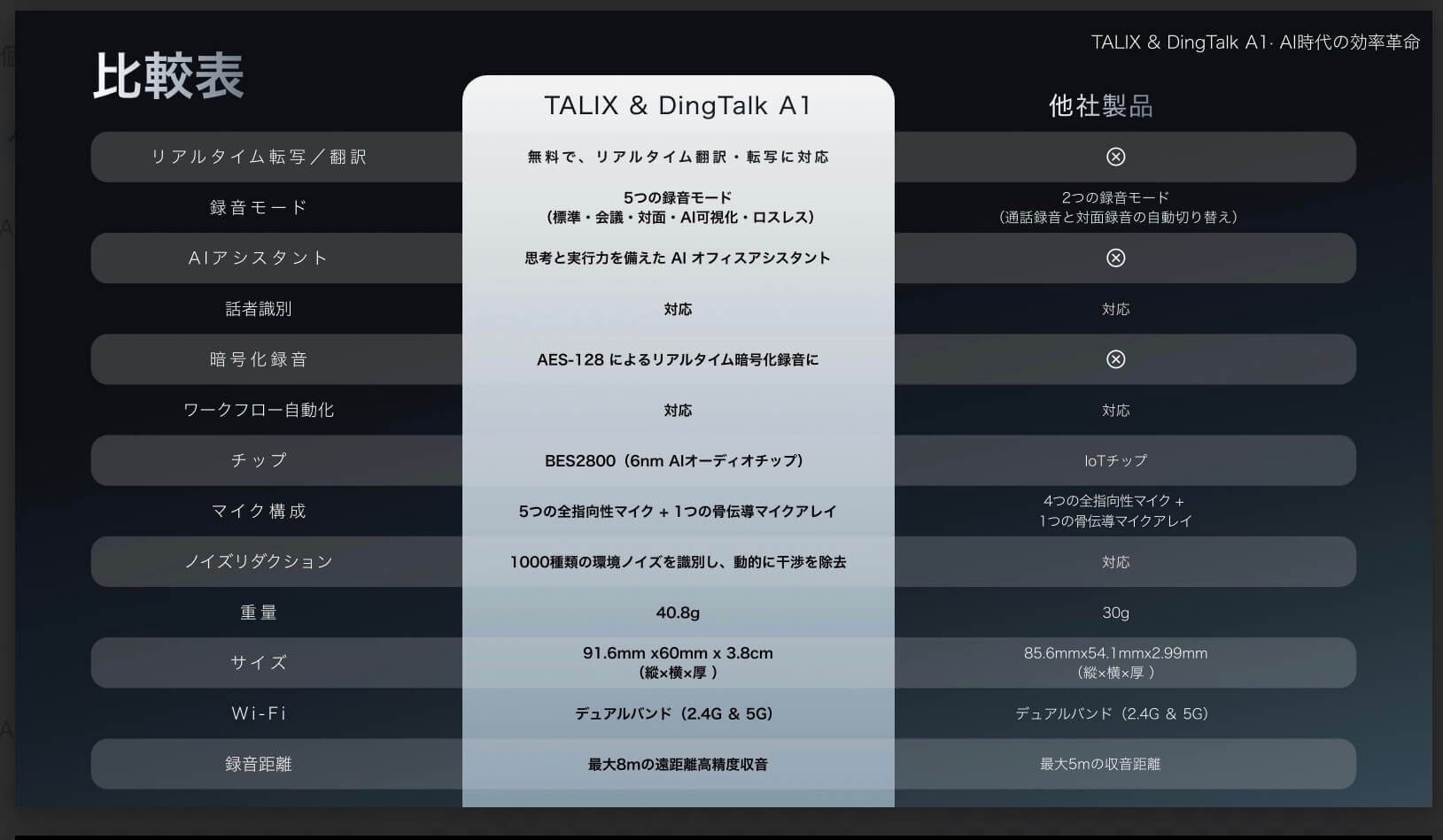 TALIX & DingTalk A1と他社AIレコーダー比較表