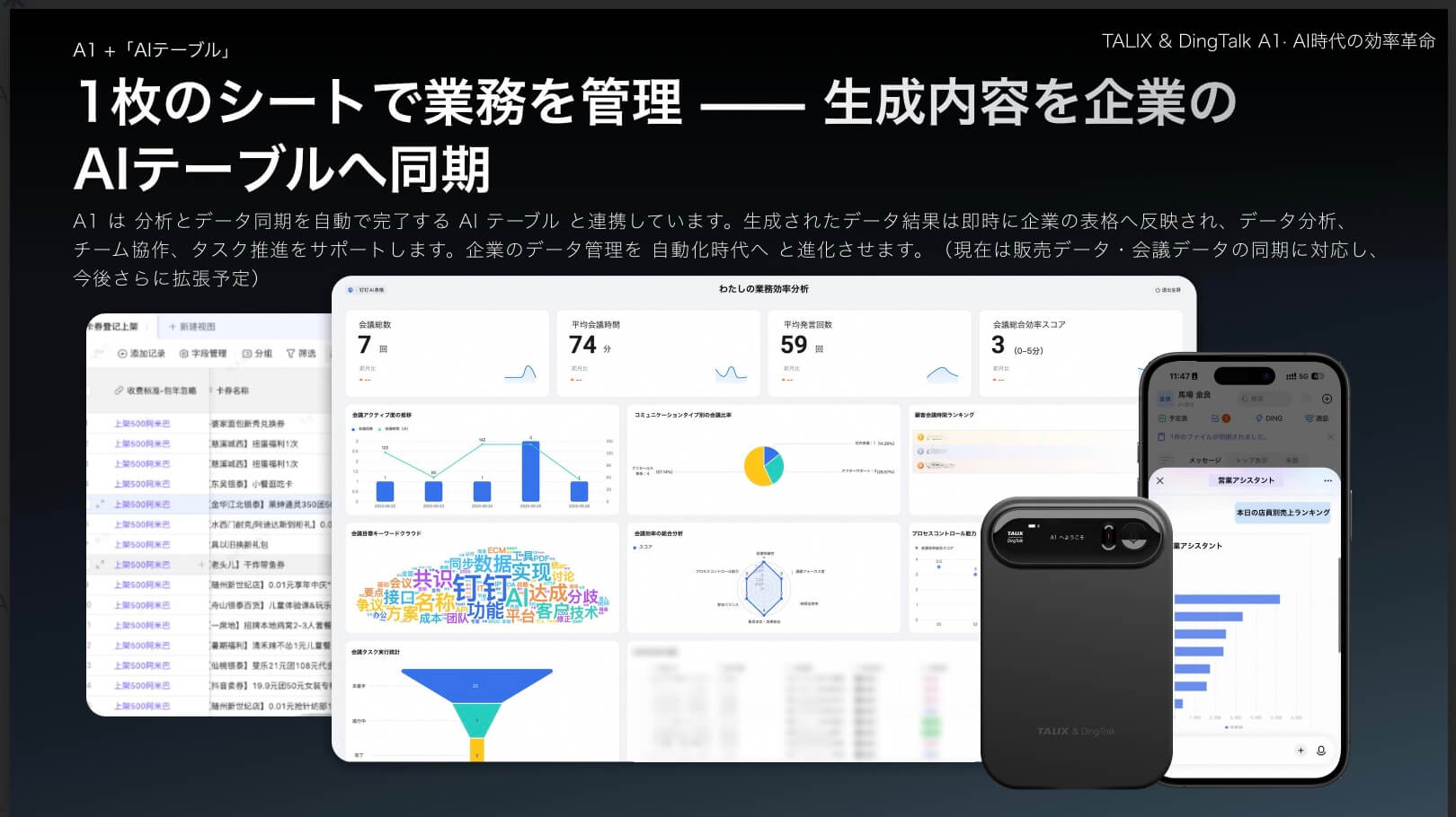 TALIX & DingTalk A1を使えば、記録をそのまま残すだけでなく、分析や振り返りに活用できます。継続的な業務改善を進めたい企業にとって大きなメリットとなるでしょう。