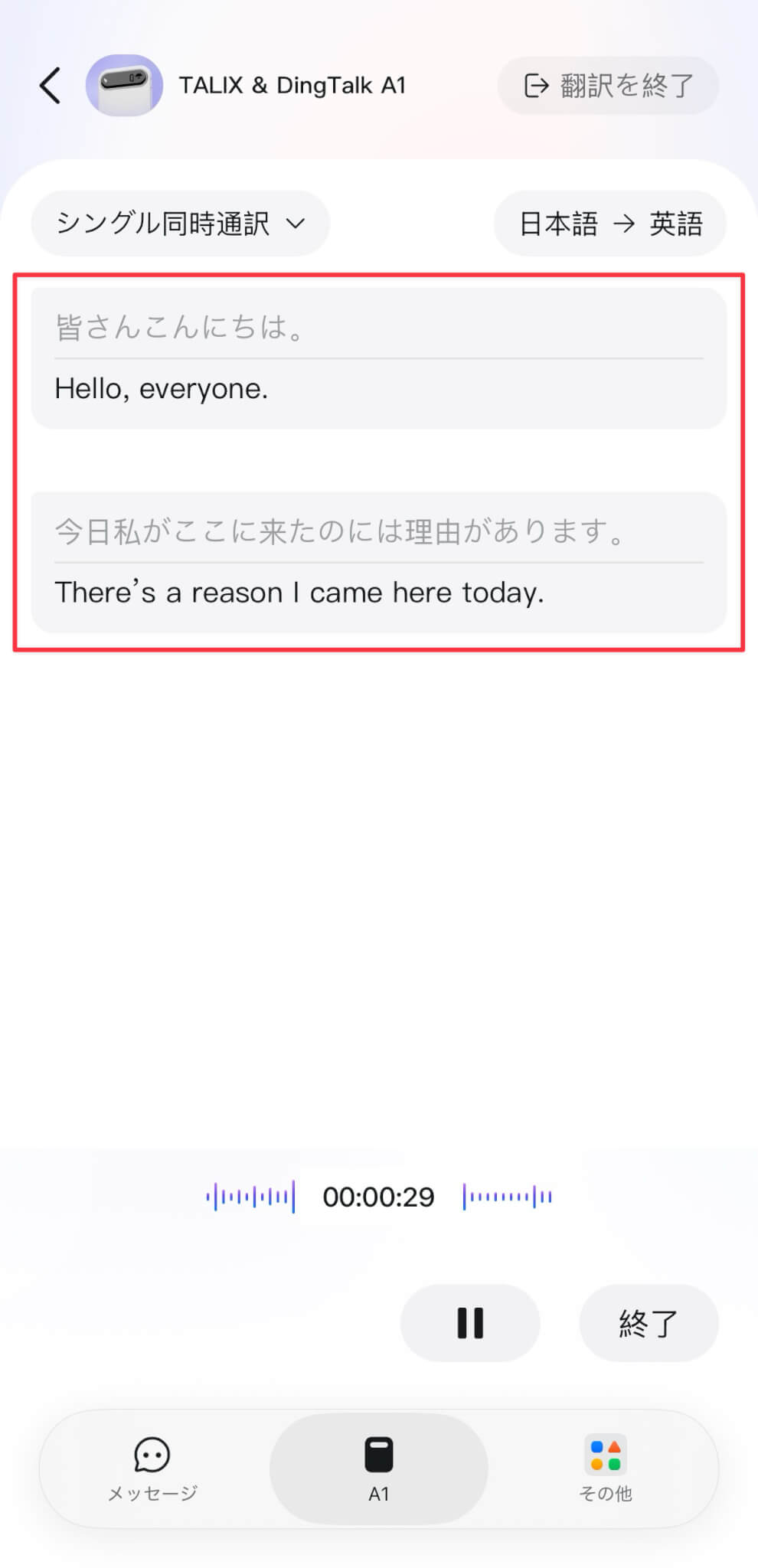 TALIX & DingTalk A1を実際に使ってみて最も良かった点は、「リアルタイムの音声文字起こし・翻訳機能」です。