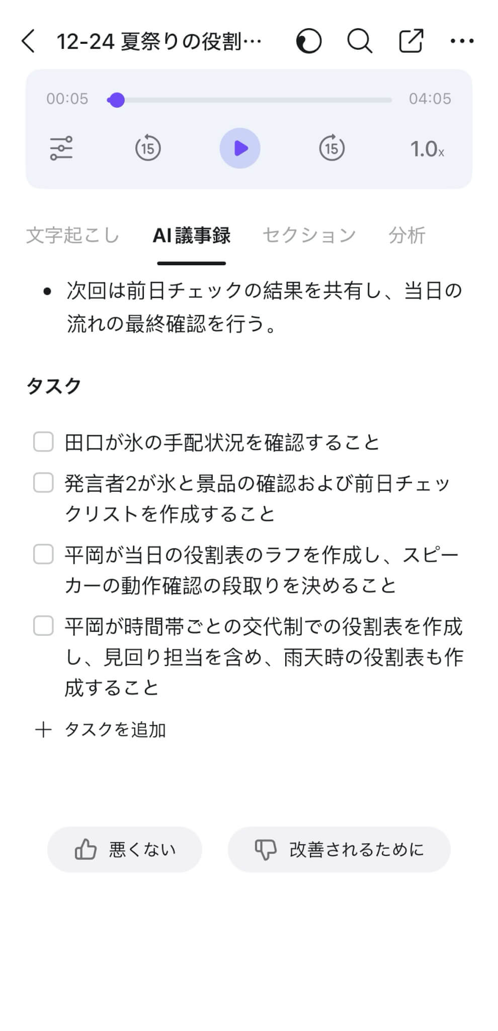 まず議事録を作成すると下部にタスクが一覧で表示されます。