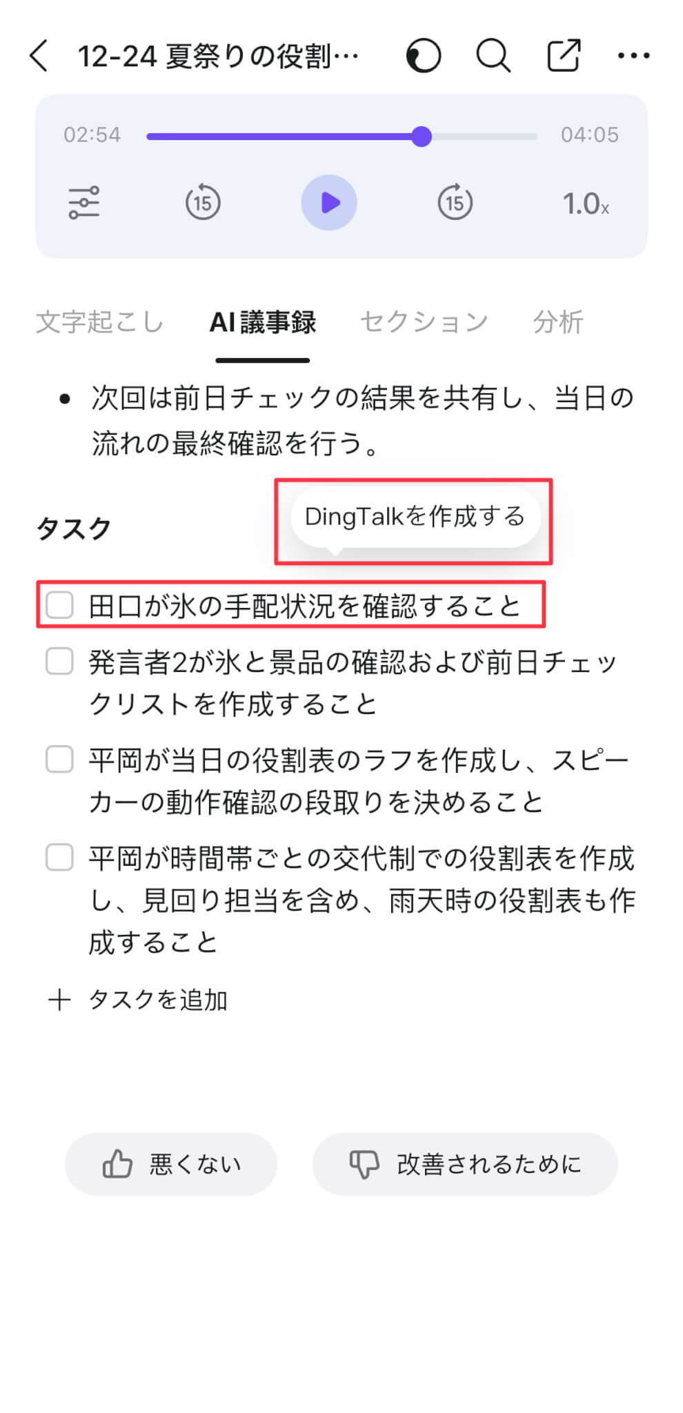 もちろん、聞き逃した内容をすぐに確認できることも重要ですが、実際のビジネスシーンにおいて一番の問題となるのは、「後から思い出せない」「議事録がきちんと残っていない」ことによる損失です。その点、TALIX & DingTalk A1は会議の内容をリアルタイムでテキスト化し、その場で共有し、さらには次のアクションへ即座に繋げられるよう設計されているため、非常に実務的なメリットがあります。