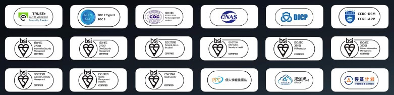 また、法人利用ではセキュリティや認証も重要なポイントですが、DingTalkは国際認証に準拠したデータセキュリティおよびプライバシー保護基準を完全に満たしており、グローバル水準の安全性を提供しているため安心して導入できます。