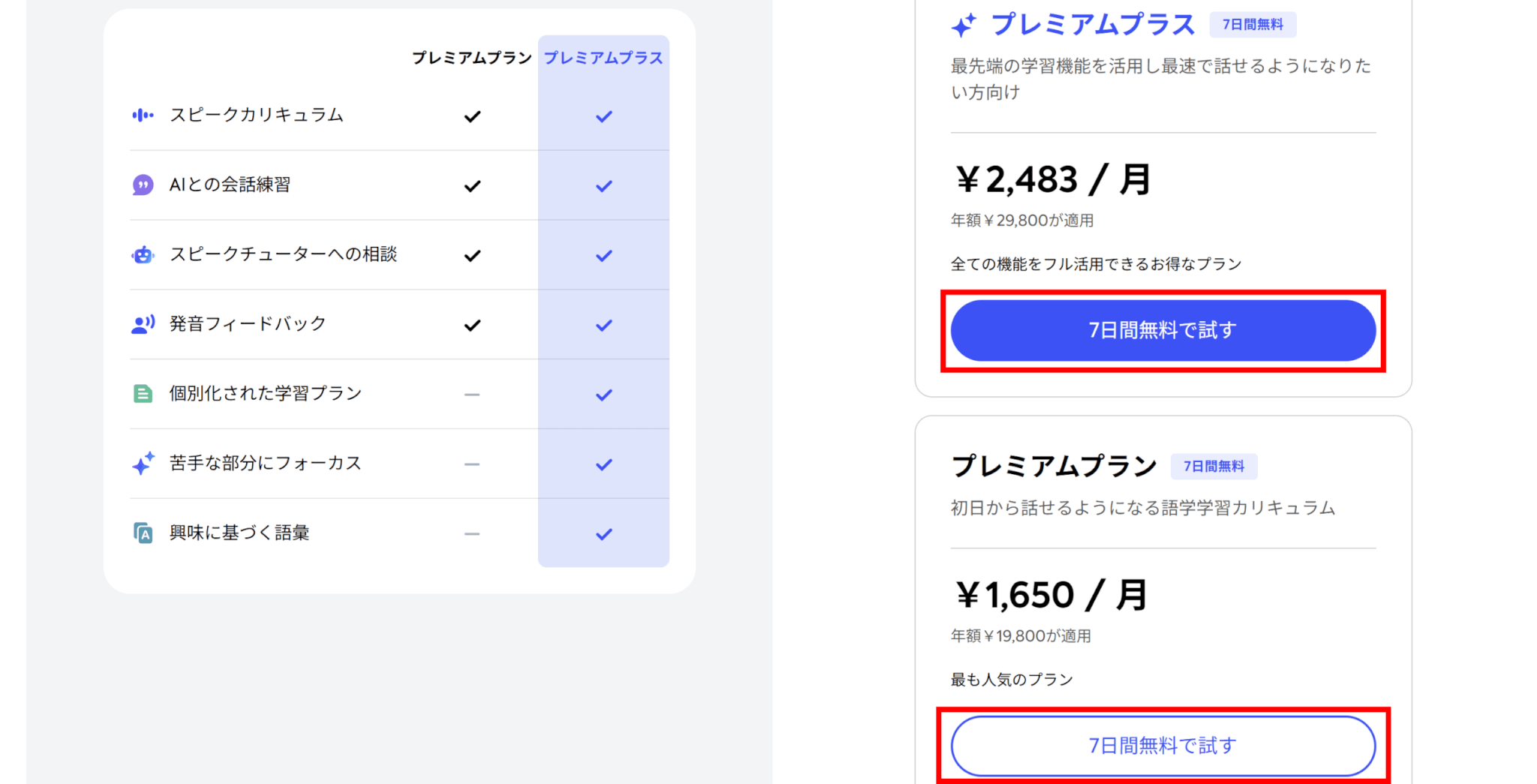 一方スピークはプレミアムとプレミアムプラスがあり、プレミアムプラスではよりパーソナライズされたレッスンの受講が可能となります。