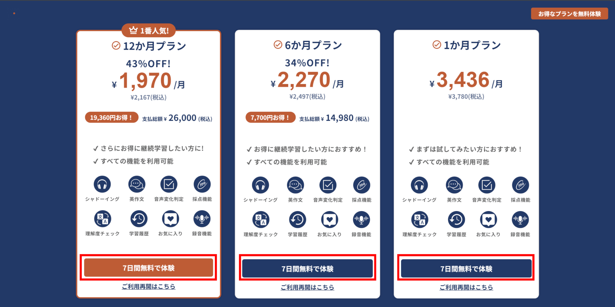 | 無料体験 | 7日間 | 7日間 | 7日間 |