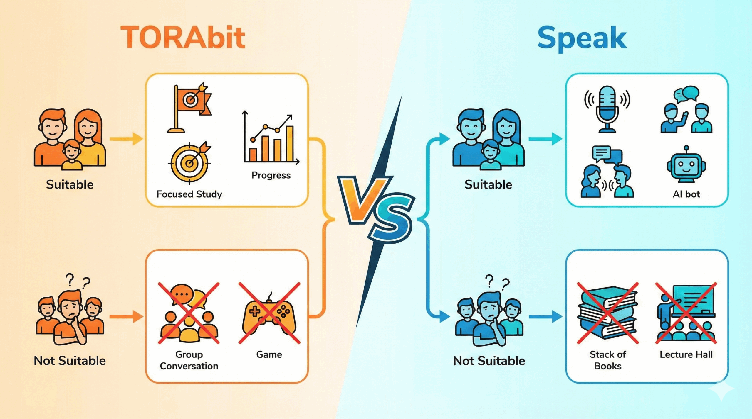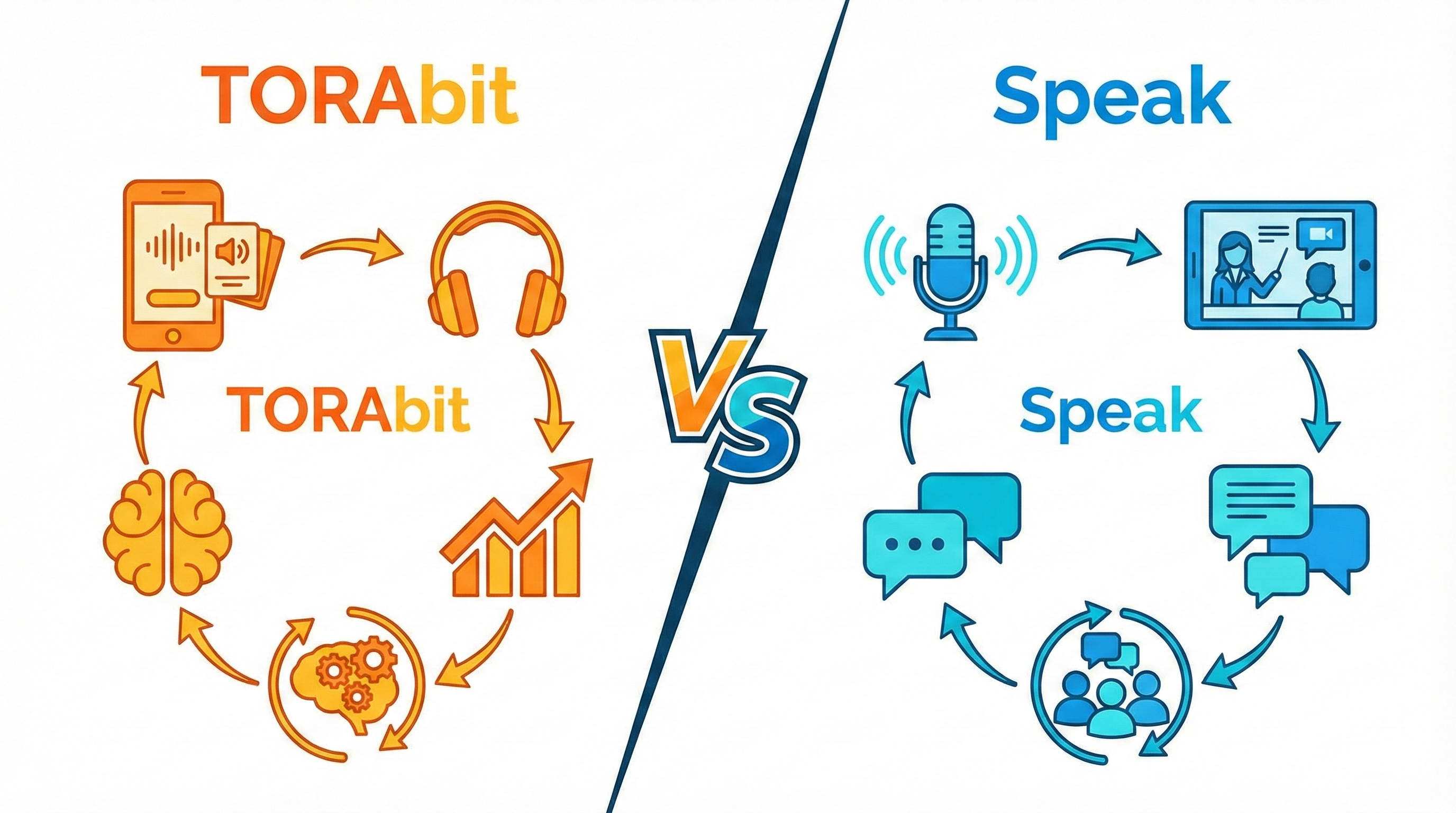 日々の学習フローにおいて、TORAbitは反復が固定メニューであり、スピークは会話や状況練習へ広がります。