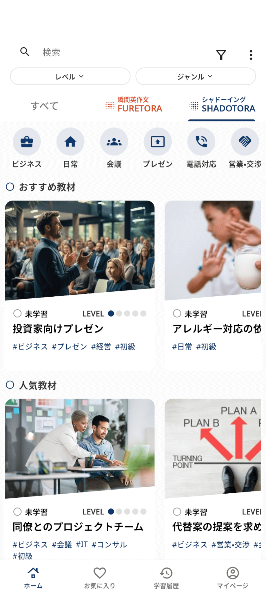 TORAbitの教材は、日常英会話からビジネス英語までの幅広いジャンルを扱っています。特にビジネスにおいては、専門用語や会議での定型表現など、仕事で直結する内容を学びたい場合に強みを発揮します。