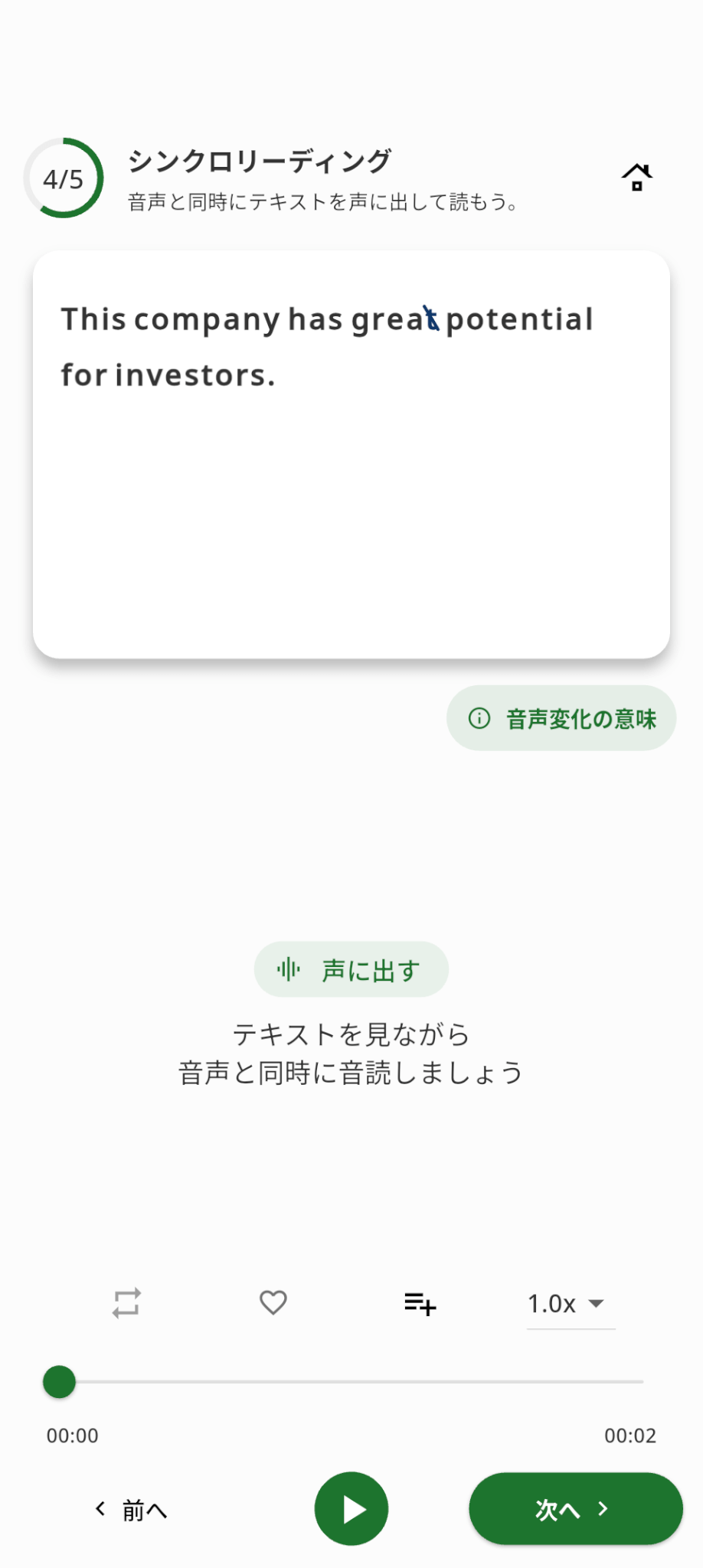シャドーイングは音声変化に触れながら段階的に進める流れが提示され、練習からテスト、採点、理解度チェックまでスマホで完結します。
