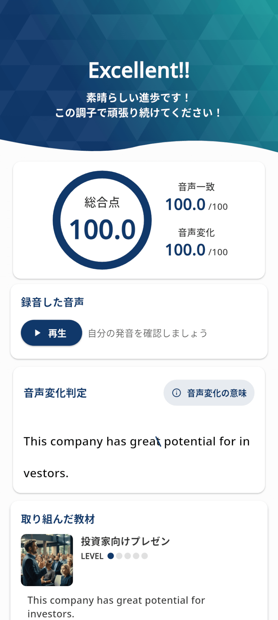 TORAbitはネイティブ音声と比較して採点されるため、正しいイントネーションやリズムが身につきます。