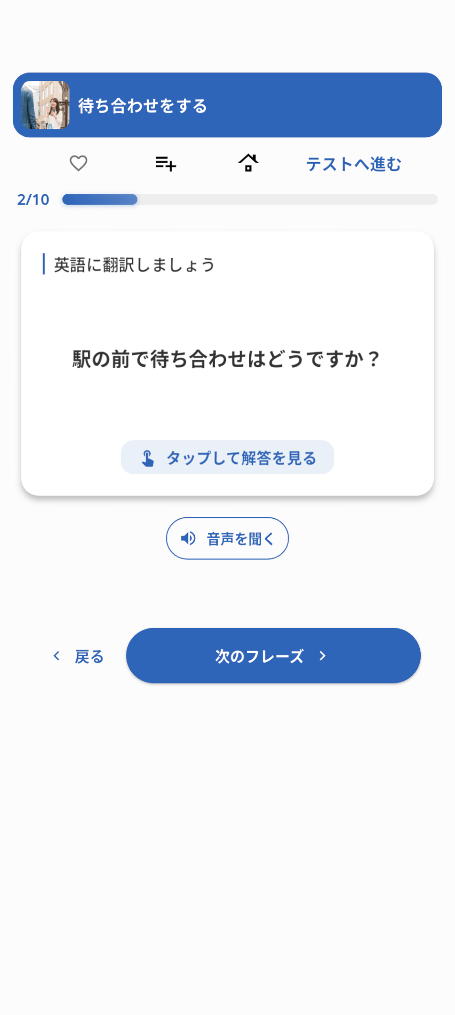 瞬間英作文は日本語を見て即座に英作文する反復で、練習モードとテストモードを切り替えながらフレーズを即座に英語で話せるようになることを目指します。