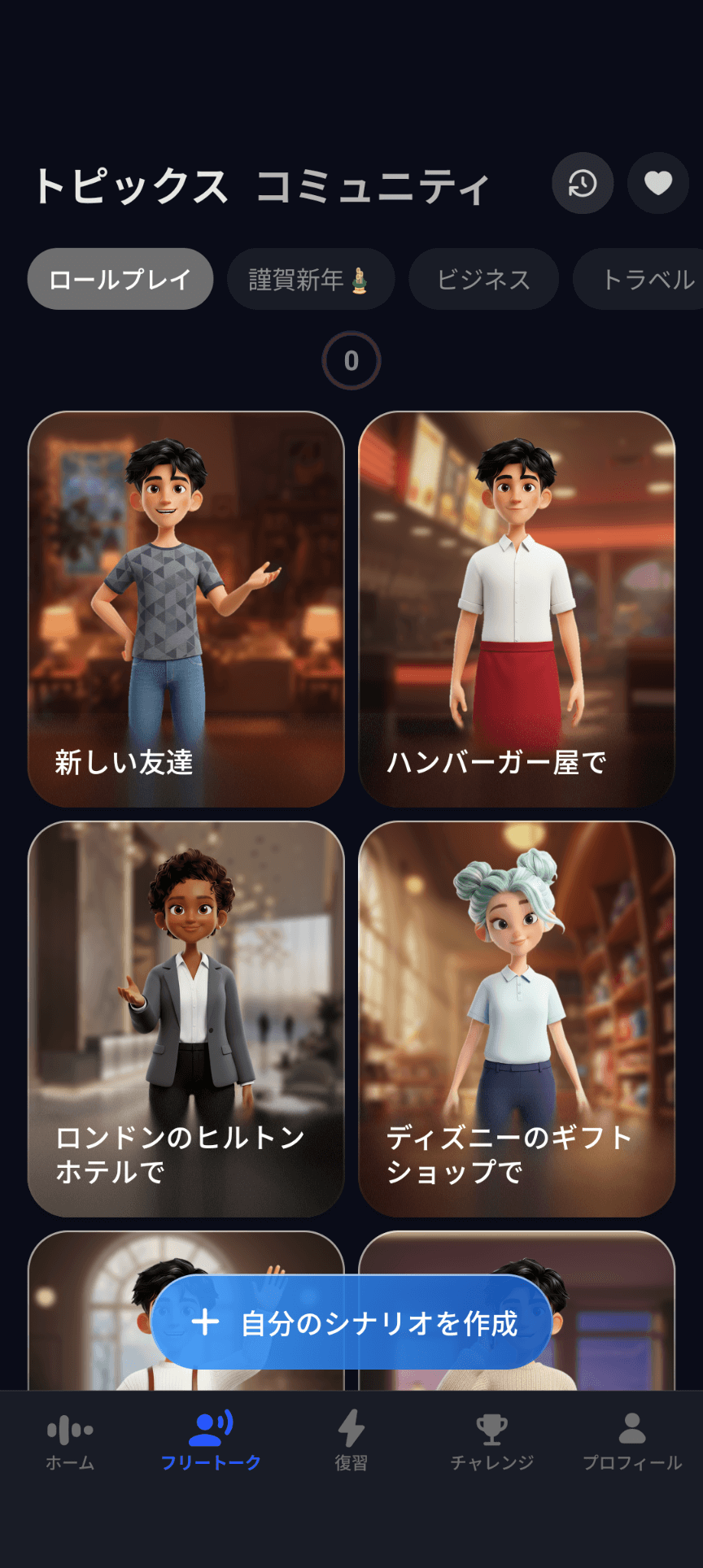 学習の中核はAIとのロールプレイであり、ユーザーの発言内容に合わせてAIが自然に応答するため、リアルな会話のラリーが続きます。