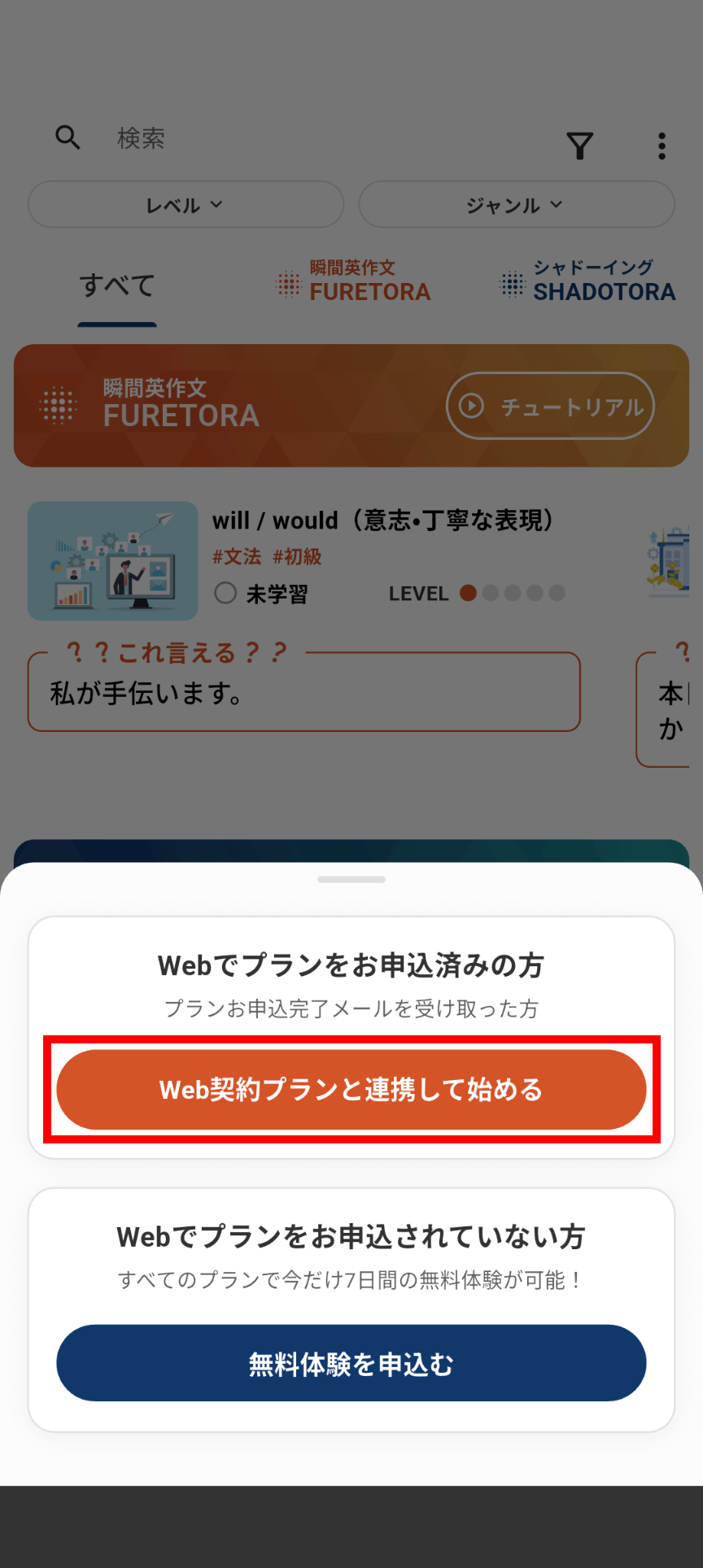 レッスンを始める際に、「Web契約プランと連携して始める」を選択しましょう。