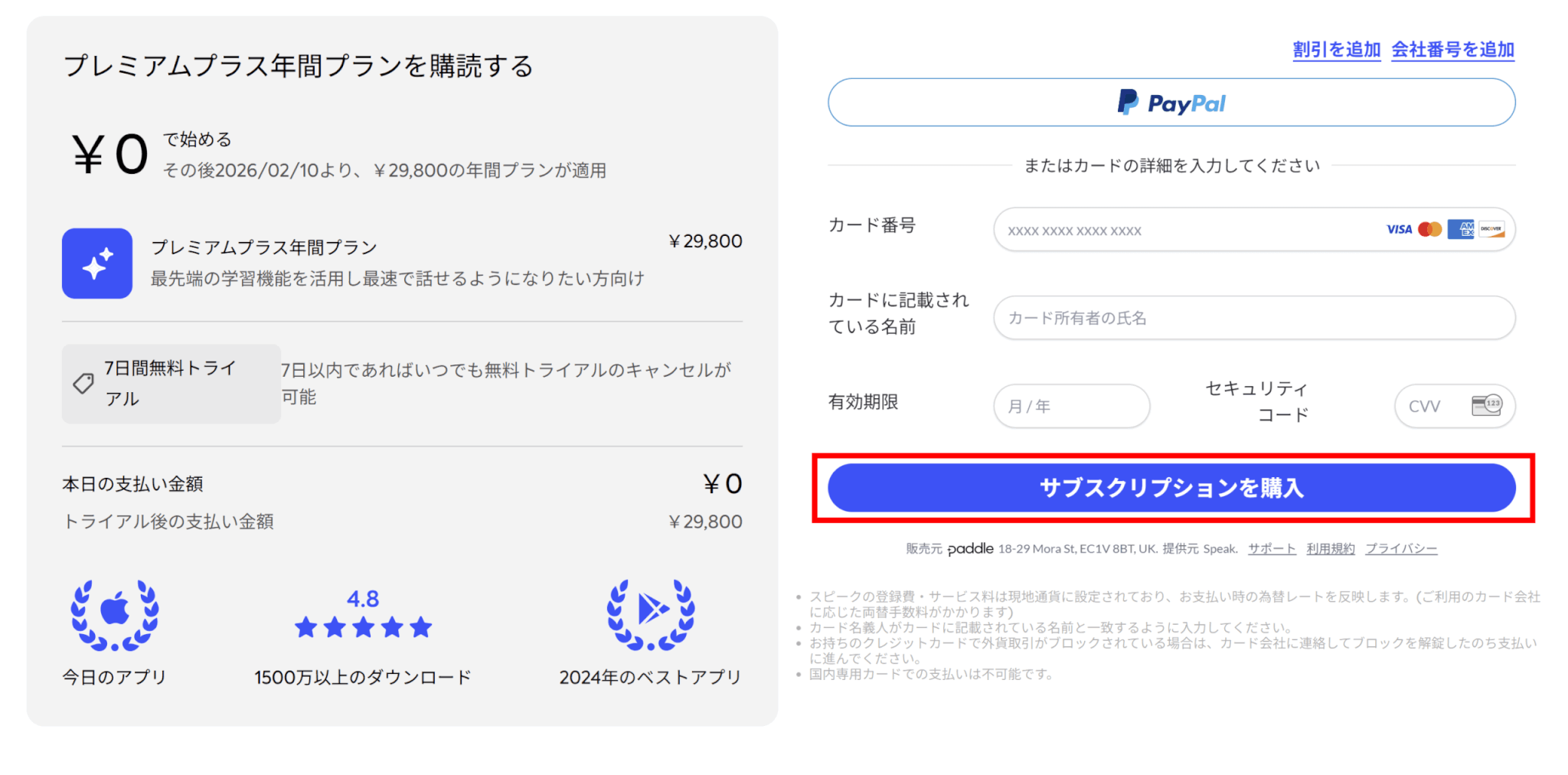 支払い方法を入力して「サブスクリプションを購入」をクリックすると、申し込みが完了します。