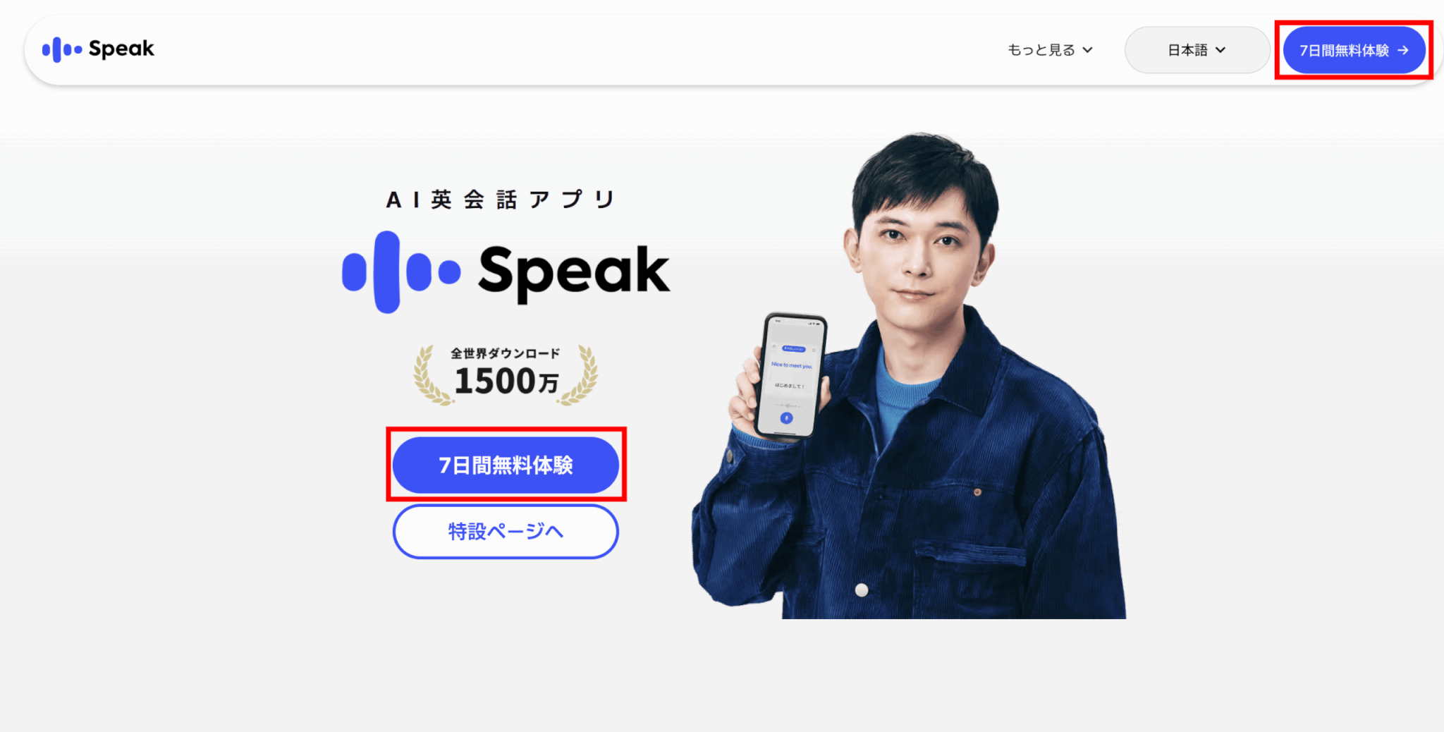 スピークの公式サイトにアクセスし、「7日間無料体験」をクリックします。