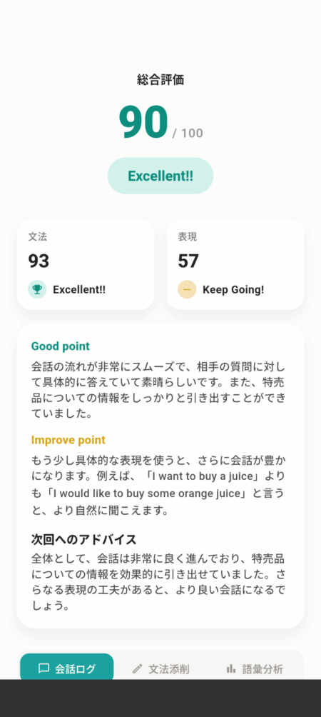 AI英会話では総合評価に加え、会話のログや文法の添削、語彙の分析まで見ることができます。