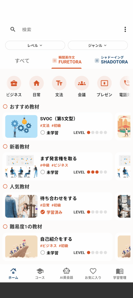 TORAbitの教材は、日常英会話からビジネス英語までの幅広いジャンルを扱っています。特にビジネスにおいては、専門用語や会議での定型表現など、仕事で直結する内容を学びたい場合に強みを発揮します。