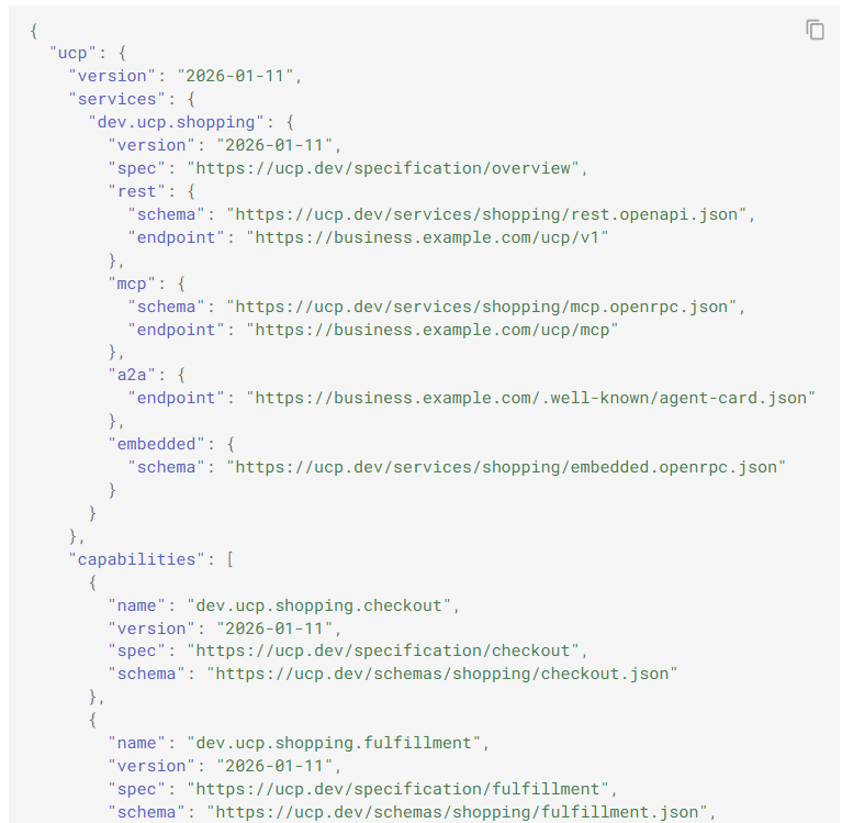 Universal Commerce Protocolを使用する場合、「自社が何を提供するか」をAIエージェントに伝えるために、Business(事業者)は「Business Profile」を設定します。具体的には、事業者は自社ドメイン配下の /.well-known/ucp にJSON形式でBusiness Profileを公開する仕組みです。