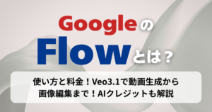 GoogleのFlowとは?使い方と料金!Veo3.1で動画生成から画像編集まで!AIクレジットも解説 Google Flowは、GoogleのVeo・Imagen 4・Geminiを活用したAI映像制作ツールです。動画生成・画像作成/編集・動画編集を1つのワークスペースで進められます。 テキストだけでなく、フレームや動画素材、生成した画像を使って一貫性のあるシーンを組み立てられます。現在は画像生成機能の統合が進み、素材作成から動画化までを一気通貫で進めやすい環境です。 この記事では、2026年3月時点の最新のGoogle Flowの使い方を、初めて触る人にもわかりやすくまとめ、料金やクレジットまで解説します。最新情報ベースで確認したい人はぜひ参考にしてください。