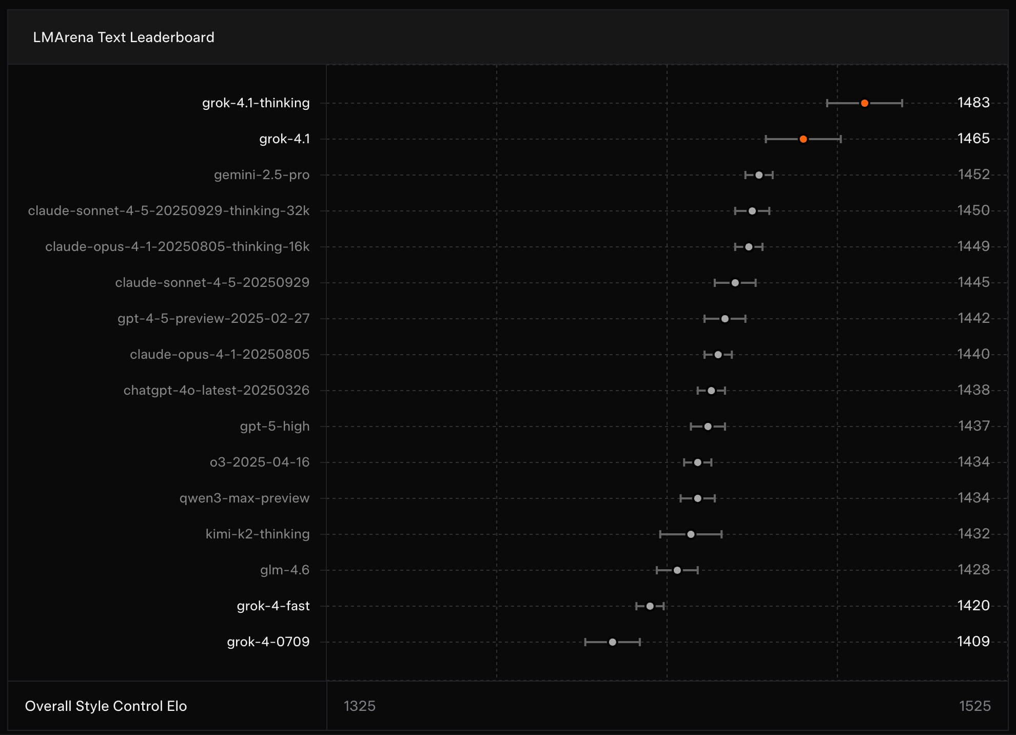 能力面の評価も公開されており、LMArenaのText Arenaでは「Grok 4.1 Thinking」が1483 Eloで1位、「Grok 4.1」も1465 Eloで2位となりました。