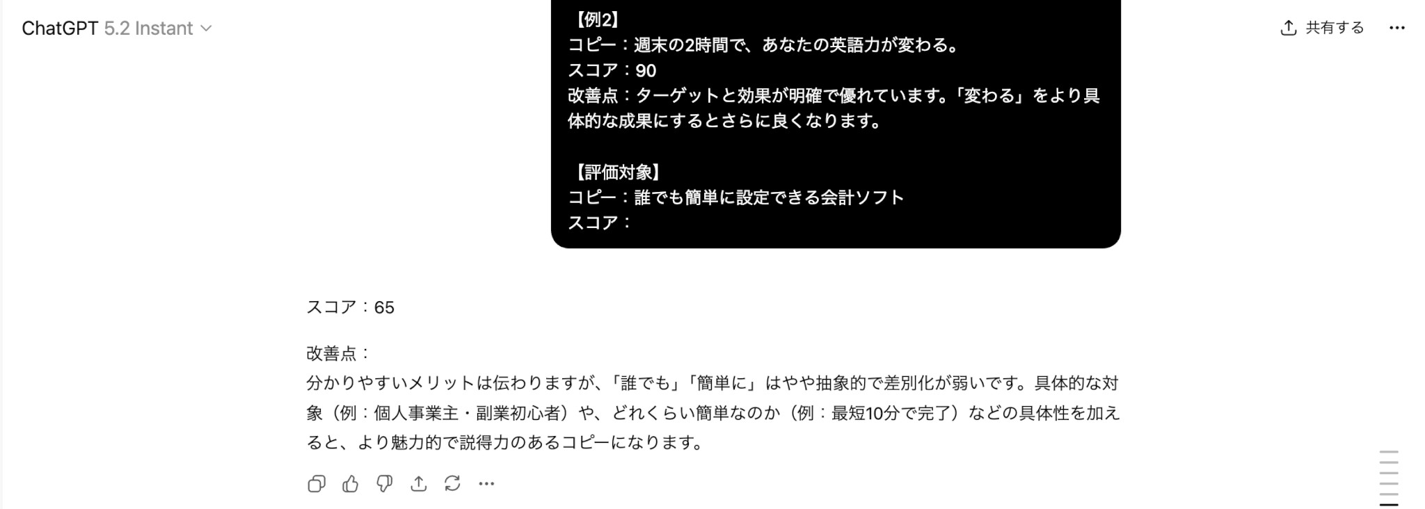 具体的なイメージを掴んでいただくために、そのままコピーして入力できるFew-Shotプロンプティングの例文を紹介します。