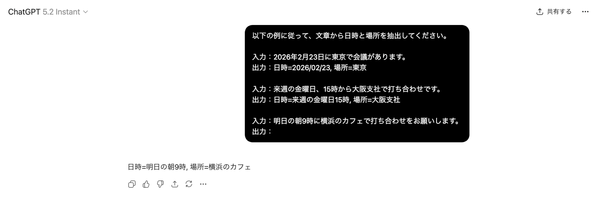 これにより、AIが提供された例から具体的な文脈や表現のニュアンスを推測し、要求に適した応答を生成できるようになります。