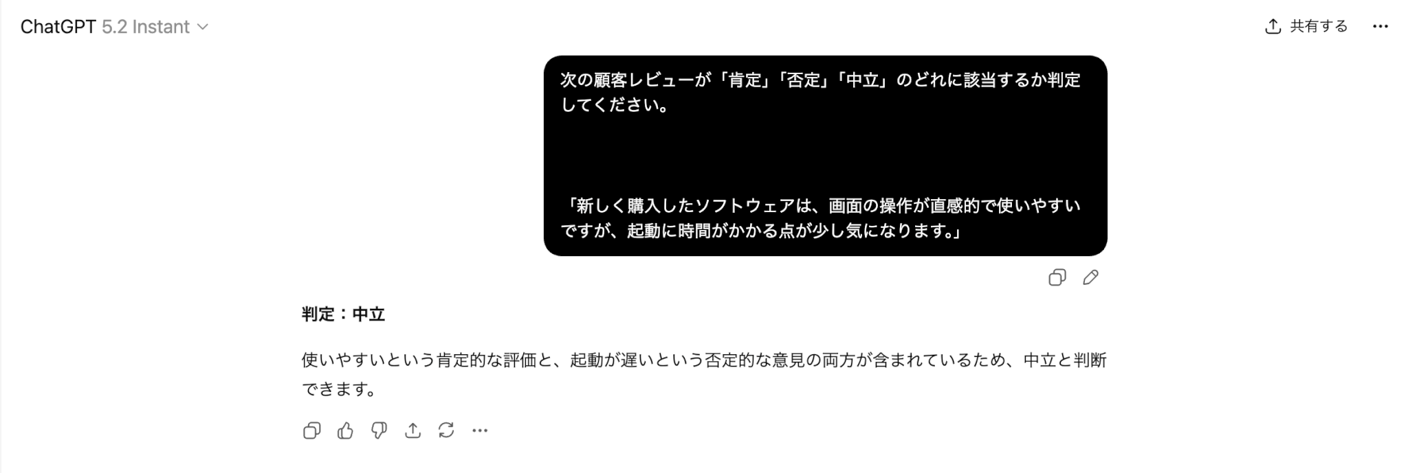 次の顧客レビューが「肯定」「否定」「中立」のどれに該当するか判定してください。[対象の文章]