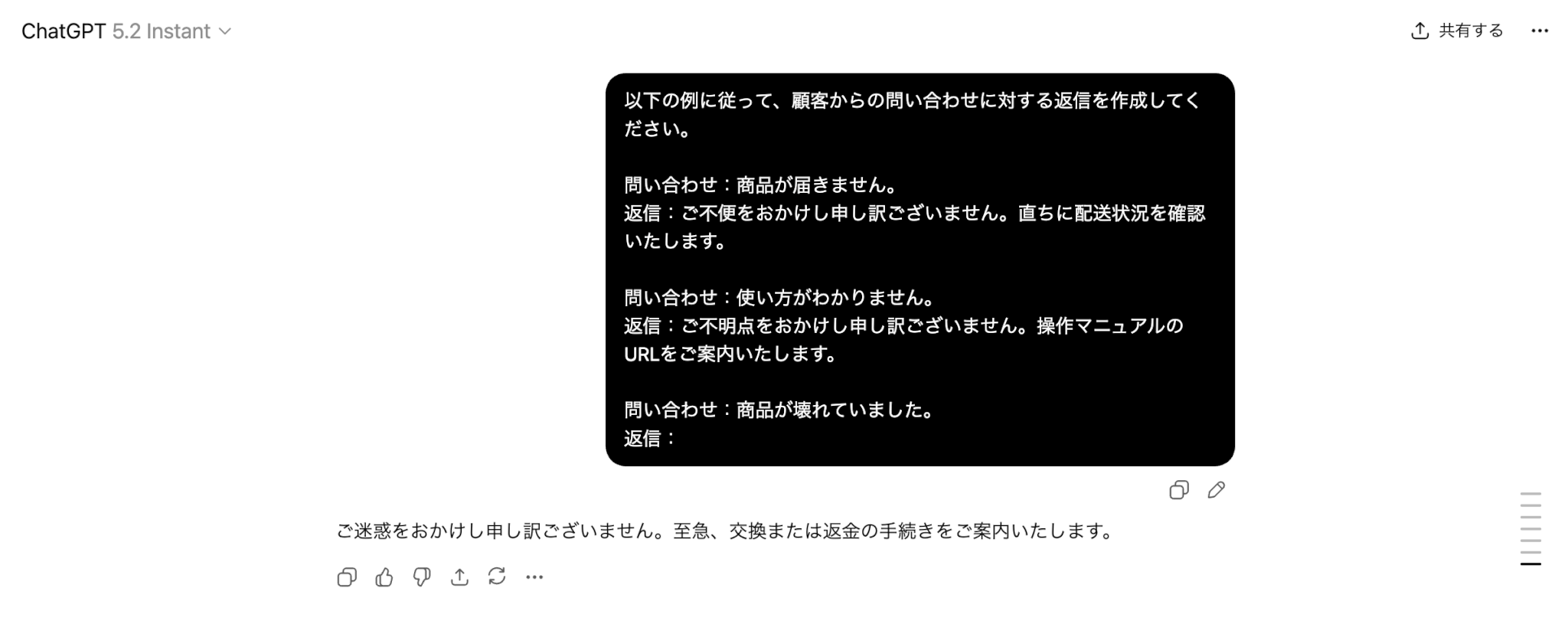 以下の例に従って、顧客からの問い合わせに対する返信を作成してください。